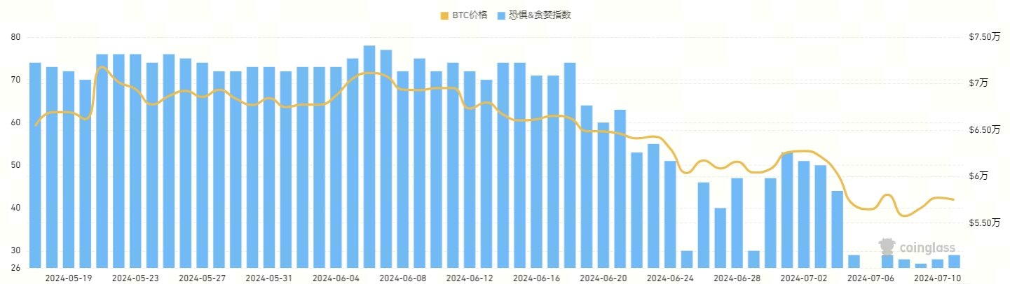本周市场抛压持续减弱,比特币(BTC)价格出现上行趋势,带动市场走强。7月15日,以太坊现货ETF可能落地,市场短期情绪获得支撑。受此影响,比特币恐慌指数逐渐向好。