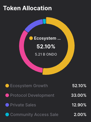 种子轮:在2021年12月,Ondo Finance以每代币$0.013的价格筹集了$400万,实现了99.87倍的投资回报(ROI)。共售出3亿代币(总供应量的3%),由Pantera Capital领投,设有1年初始锁定期,随后为24个月释放期。