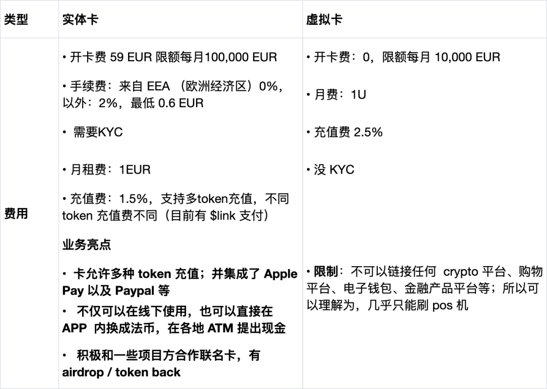 做硬件钱包的 Onekey 和 Dupay 在去年就已推出虚拟卡和实体卡,为大陆用户提供了购买 OpenAI ChatGPT 的可能,商业模式是主要是赚取开卡费和交易手续费,且不同等级的卡片有不同的限额和手续费标准。除了 Web3 原生支付卡商,各大交易所也结合自己的业务形式推出了赚取手续费、开卡费外的商业模式。这个业务逻辑是交易所本身就有交易后出金的支付场景,且相对于传统支付卡商,交易所用户使用加密支付卡有更低的教育成本;从使用角度来说,用户的交易所app借用原有的交易产品矩阵,可以直接和卡进行交互,大大提高了用户切换不同平台转账、充值等使用体验。主体 4:卡组织
