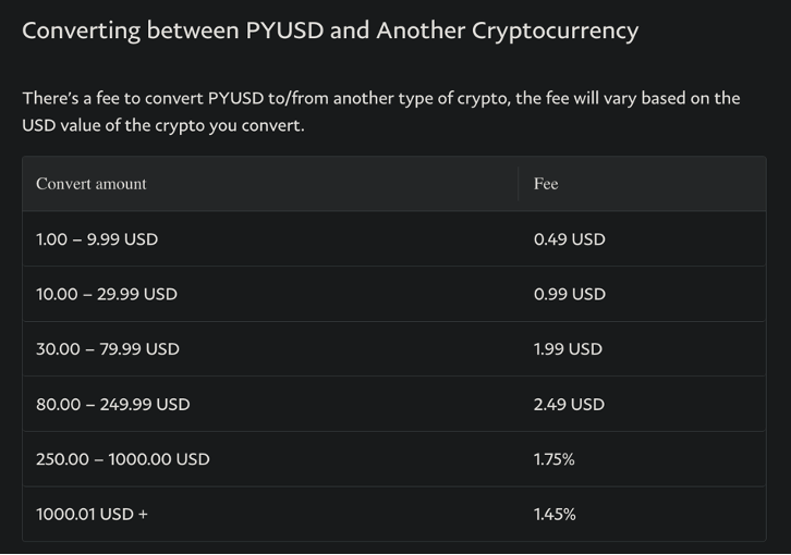 (3)转换加密货币:PYUSD 可以与 Paypal 支持的其他加密货币进行转换,手续费根据转化的数量有所不同,从 1.45% ~ 4.9%不等,手续费较高;且由于目前只支持以太链,所以稳定币转出的网络费用会非常贵。