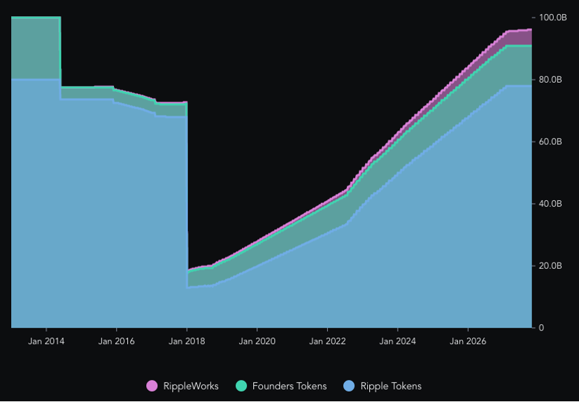 XRP 的供应量固定为 1,000 亿个代币,20% 为代币创始人所有,80% 为 Ripple 本身所有,即 800 亿代币。Ripple 最初分配的 250 亿 XRP 被分发、出售,另外 550 亿 XRP 被存入 55 个智能合约托管账户,每个合约包含 10 亿个 XRP 代币。这些合约每月系统性地向市场发放 10 亿个代币,总周期为 55 个月。在下一次解锁开始时,未使用的 XRP 将被放回托管账户,在 XRPL 上进行每笔交易时,都会有一些 XRP 被用作交易费并被销毁,从而产生通货紧缩压力,但是由于费用本身很低,所以造成通货紧缩的压力很小。