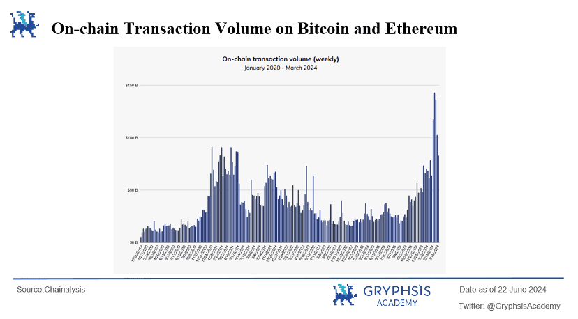 (3)从链上数据来看,从 2020 年 1 月到 2024 年 3 月,链上交易量和交易活跃度持续增长。在一系列利好事件的推动下,这些指标屡次突破历史新高,即将突破 1,500 亿美元大关。在 Web3 领域,许多项目方和交易所看到了行业的上升趋势及加密支付的巨大机会,纷纷加快各地区支付牌照的申请,拓展发卡业务及其他将 Web3 支付与实体经济相链接的业务,同时加快交易所以及链上钱包设置的建设。近期,Coinbase 宣布推出自托管钱包平台,该平台集成了资产和身份管理、购买、发送、交换、NFT 以及交易历史等功能,为其用户提供了更加便捷的链上交易途径。这不仅为 Coinbase 的用户群体提供了更多便利,也成为 Onchain Summer 活动的重要组成部分,进一步推动了 Web3 支付的发展。