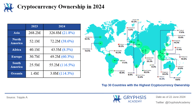 根据 Tripple A 的报告,截至 2024 年,加密货币的全球渗透率为 6.9%,全球范围内约有 5.6 亿人拥有加密货币,相比去年的 4.2 亿人增长了 33%。其中,亚洲是加密货币拥有最多的大洲,南美和大洋洲为占有比增长最快的地方(116.5%),迪拜的人口渗透率占比为 25.3%,为加密货币拥有人口占比最高的国家,配合着当地的金融自由区、个人所得税和资本利得税减免优势,这也解释了为什么迪拜会成为近两年很多交易所和加密公司的总部。因此,不管是人口占有比最高的地域、还是拥有人口占有比增长最快的地域,本质上是政策的宽松和现实交易的需要,都会给予加密支付探索和发展的良机。