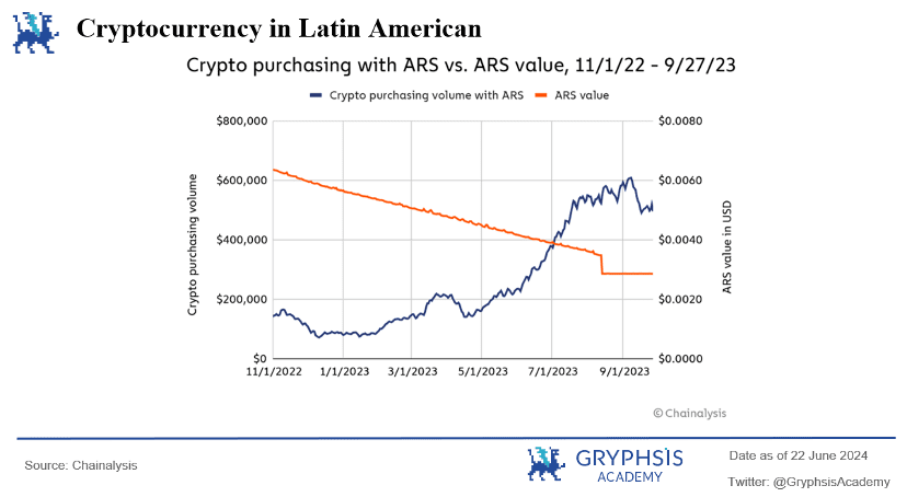 几十年来,阿根廷一直面临经济困境,货币极端贬值的周期性损害了居民的储蓄能力,使日常金融活动变得困难,因此阿根廷也是拉丁美洲加密货币最为活跃的地方。2023 年,阿根廷的通货膨胀率达到了 211.4%,根据 Chainalysis 数据显示,阿根廷大约有 10.9%,大概500 万人(总人口为 4580 万)使用加密货币进行日常生活的支付。为了防止比索的贬值,阿根廷人拿到比索计价的薪水后会立即将其兑换成 USDT 或 USDC ,每个人几乎都知道美元和比索的汇率。类似的,土耳其也是加密货币发展迅猛的地点之一。因此,在法律法规允许的情况下,存在贬值需求的地方会是加密货币成为“硬通货”的地方,也更容易展开加密货币相关的支付业务。