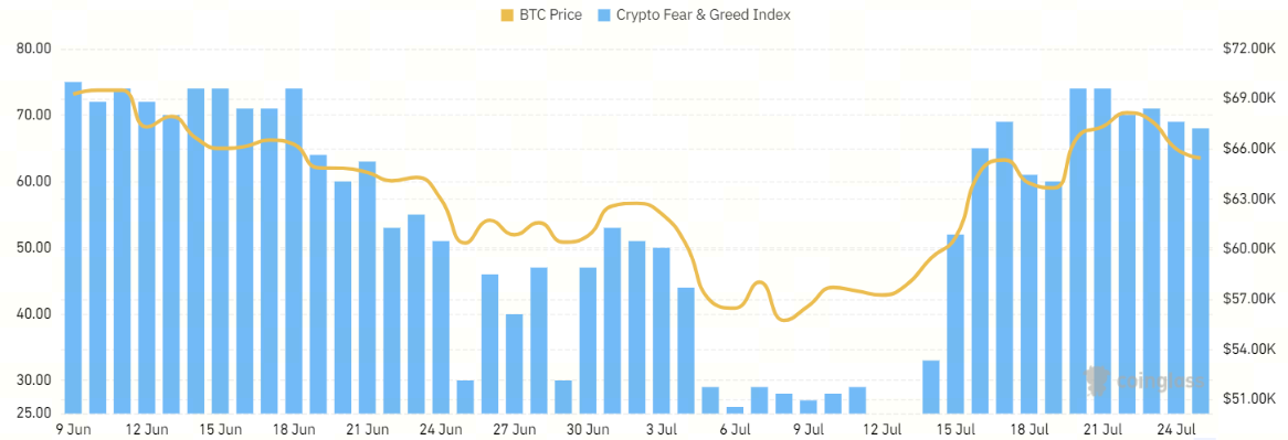 最近市场受美股和以太坊ETF落地影响开始走弱,比特币(BTC)价格走势开始转弱,山寨市场也随之下行。市场短期情绪依然在高位,未来一周走势难言乐观。