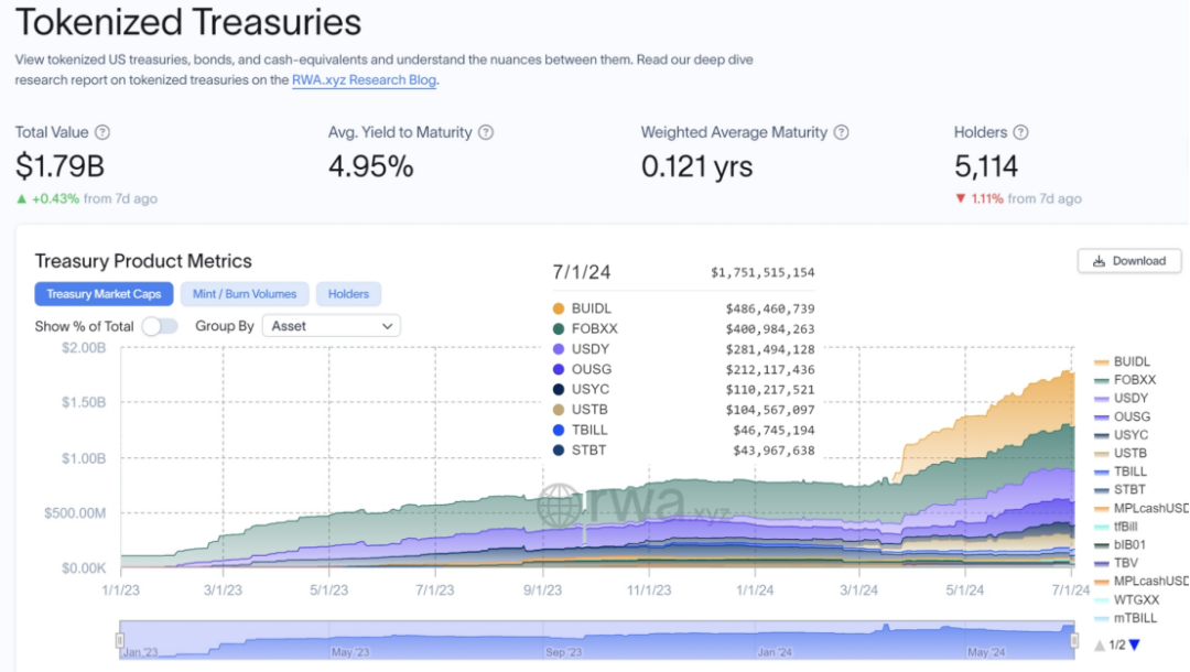 目前的高利率环境使得基于美债的代币化用例受到市场的诸多关注,并且其产品确实能够实现经济效益,提高资本效率。根据 RWA.XYZ 数据,代币化美债市场规模已经从 2024 年初的 7.7 亿美金上升到如今的 17.5 亿美元(截至 7 月 1 日),上涨幅度达到 227%。