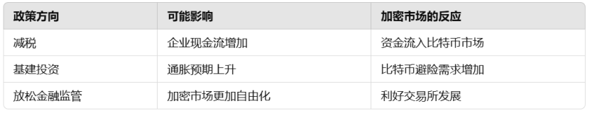 特朗普在2025年的总统竞选成功,为全球经济和市场带来了新的不确定性。他的经济政策将延续其过去“美国优先”的主张,注重降低税收、推动制造业回流、加强对华竞争等。这种政策导向对传统金融市场和加密市场都会产生重大影响。