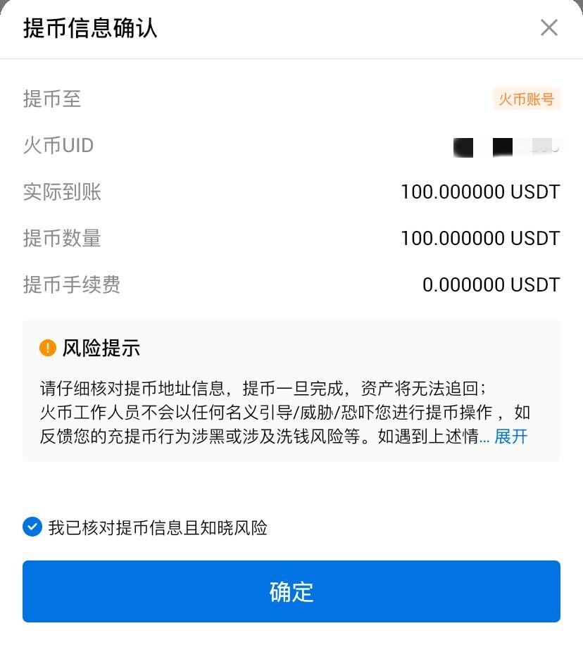 3. 选择提币网络,输入提币地址,输入提币数量,确认后点击下方【提币】。若为内部转账,输入火币UID即可。再次提醒:谨慎选择网络,务必确保所选网络与提币平台的网络保持一致,否则将造成资产损失。