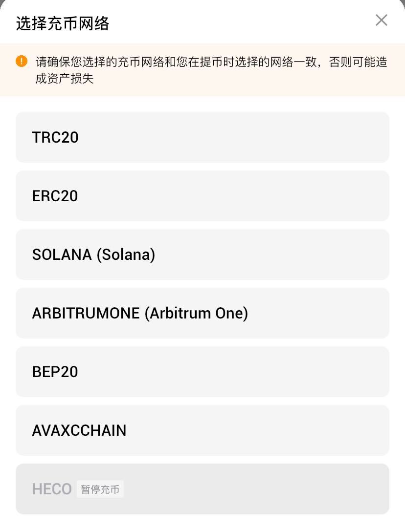3. 选择充币网络,如TRC20。注:请谨慎选择充币网络,确保所选网络与提币平台的网络保持一致,网络选择错误将造成数字资产损失。