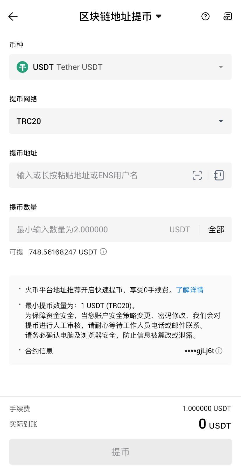 2. 选择币种如USDT,选择提币地址类型,可通过区块链地址提币,也可提币到其他火币账户(0手续费)。