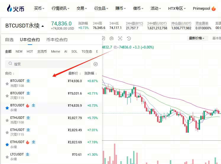 2. 新手建议选择U本位永续合约进行交易,点击左上角选择交易对,如BTCUSDT永续,意思是使用USDT进行BTC的合约交易。